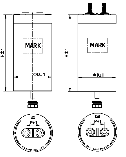 Un (V.DC) | Cn (μF) | Dimension | ESR (mΩ) | Ls (nH) | Ipeak (A) | Rth (K/W) | Irms@45℃10KHz (A) | Part number | |